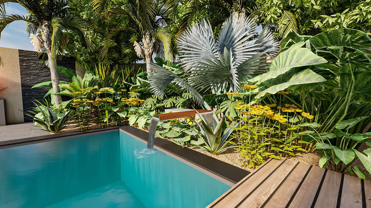 La végétation luxuriante compose une toile de fond exotique : palmiers, strelitzias, alocasias et plantes graphiques forment une ambiance tropicale dense, tout en restant facile d’entretien grâce au choix d’espèces adaptées au climat méditerranéen.