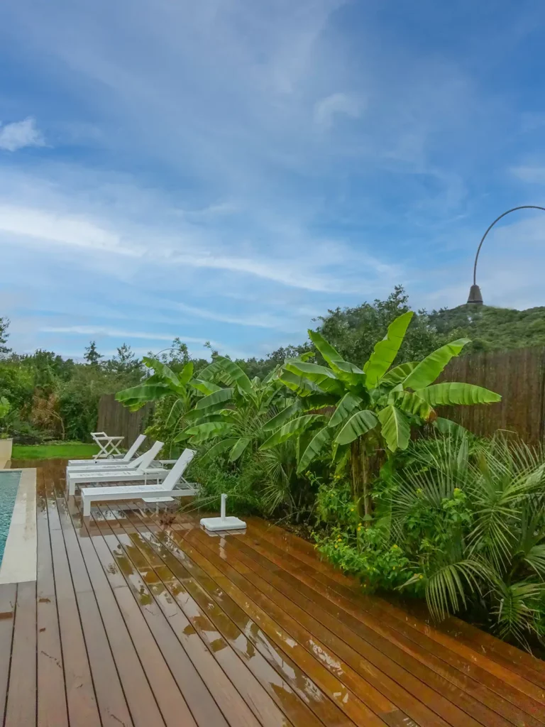 L’ancienne piscine a été entièrement modernisée : rehaussement du sol intérieur, modification des escaliers de piscine, création d’une plage immergée et remplacement de la mosaïque pour offrir une teinte d’eau unique et naturelle. Le pourtour de la piscine a été transformé avec un côté en dallage beige et l’autre côté en terrasse bois. L’ensemble a été pensé dans une ambiance Bali, avec des végétaux tropicaux résistants à la sécheresse et au gel, apportant une atmosphère de détente et d’évasion.