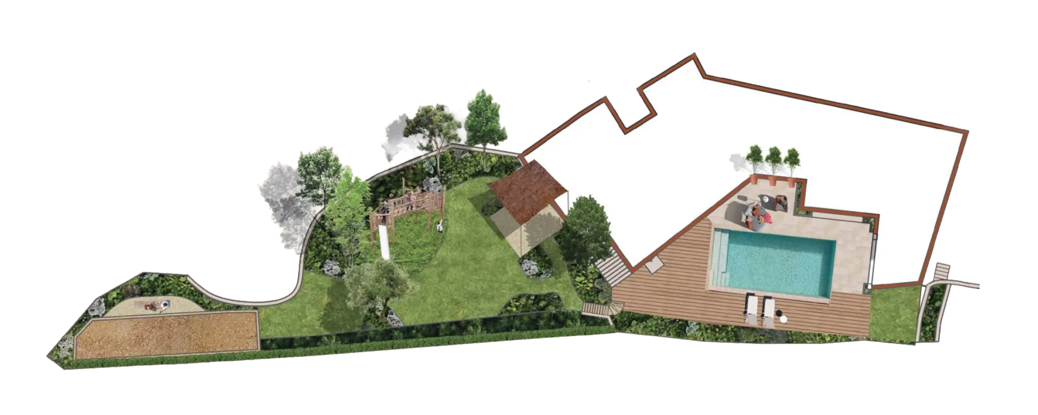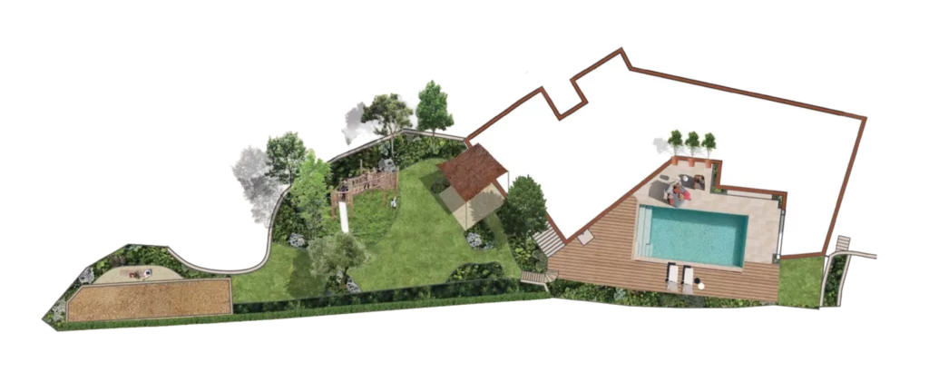 Un jardin transformé, vivant et durable, qui offre désormais une diversité d’espaces : détente, baignade, jeu et partage. Les plantes locales et économes en eau favorisent la biodiversité et attirent les pollinisateurs, tout en demandant peu d’entretien.
